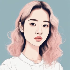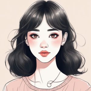 A minimalist hand drawn line art illustration, a cute fashionable girl anime portrait. Emphasis on glossy lips and beautiful detailed eyes. Style is hand drawn illustration, colored pencil and crayon strokes. Utilizing warm pastel colors, soft edges, with paper texture and a whimsical storybook aesthetic. Solid color background.