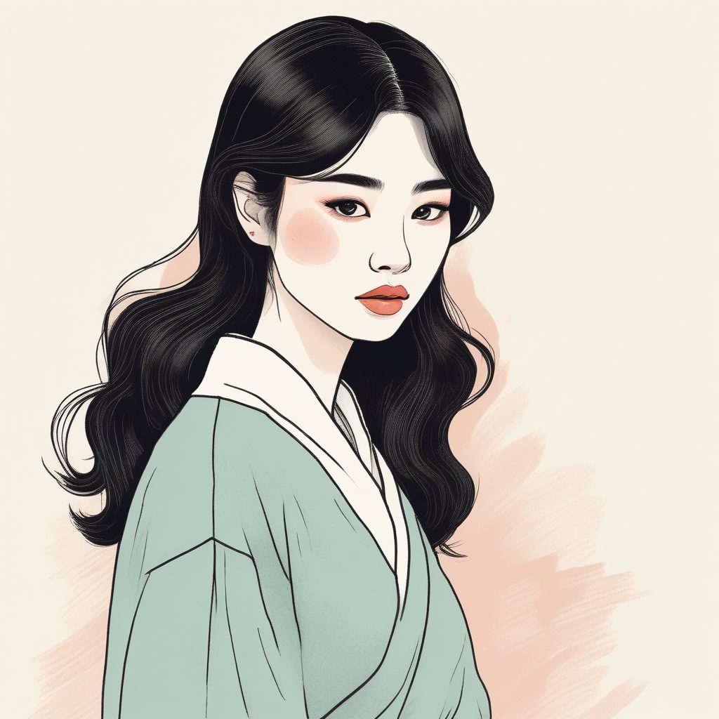 一位充满日韩潮流时尚感的美少女半身头像,以手绘插画风格呈现,使用彩铅笔触和蜡笔质感。柔和的纸张纹理和温暖色调营造出怀旧氛围。整体设计灵感来源于Whimsical和storybook style,呈现出甜美而富有故事性的视觉效果。