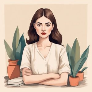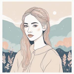 Hand drawn illustration on textured paper showing a minimalist style exquisite portrait. A cute girl with a gentle smile, captured in a storybook style. Features intricate colored pencil details and rough crayon style edges. Clean lines define the solo subject against a clean solid color soft mint background.