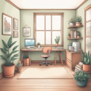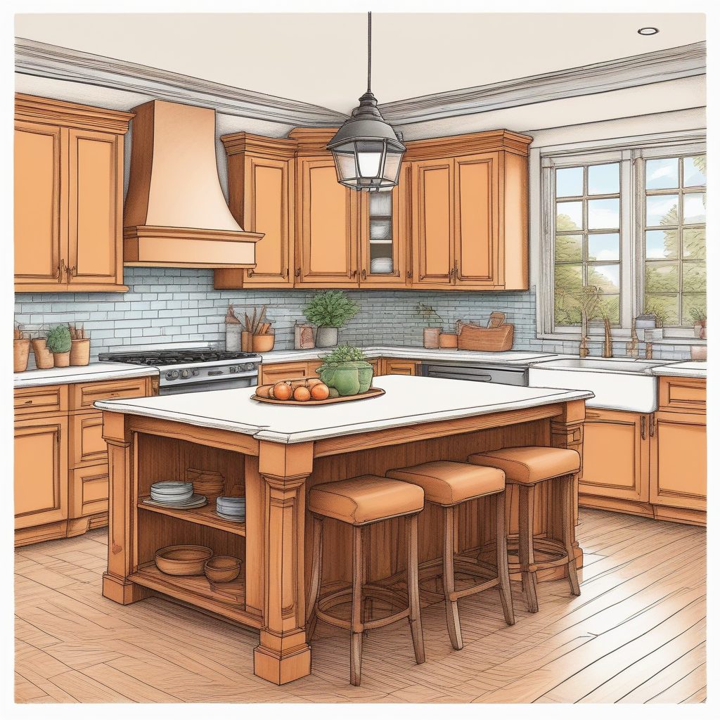 Illustration of a minimalist open kitchen island. Hand drawn in a colored pencil style, emphasizing warm colors and soft edges. Possessing a strong sense of whimsicality and storybook style, all details are presented on clear textured paper, utilizing pastel colors.