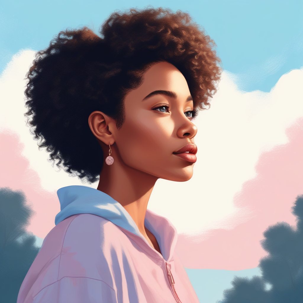 A minimalist style exquisite portrait rendered as a hand drawn illustration using colored pencil and crayon style. The artwork features a fashionable girl with soft textured hair and a sweet expression, following a storybook aesthetic. Clean lines are blended with a textured paper effect, using a dreamy pink and blue color palette. The solo subject is depicted with soft light and minimalist details against a clean solid sky blue background. The high detail focuses on the gentle character illustration and artistic brushwork.
