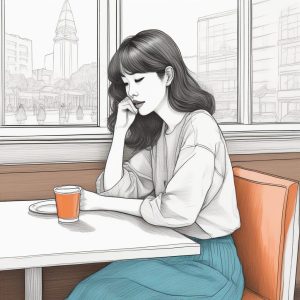 A hand drawn illustration featuring a young woman with a messy bun. This minimalist style exquisite portrait emphasizes texture using colored pencil and crayon style on textured paper. Clean lines capture her relaxed posture. The background is a clean solid color background in Morandi grey, presenting a peaceful solo subject in a storybook style.