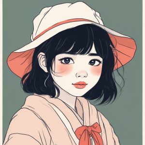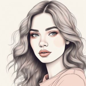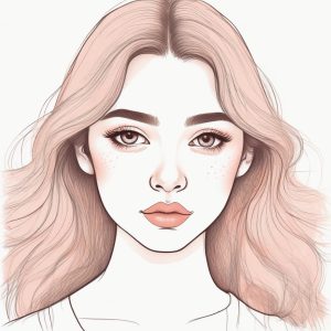 A minimalist hand drawn line art illustration, cute fashionable girl anime portrait. Colored pencil hand drawn style, soft edges, with distinct paper texture. Focus on rosy cheeks, rouge, and beautiful detailed eyes. Utilizing warm pastel colors, whimsical storybook atmosphere. Glossy lips. Solid color background.